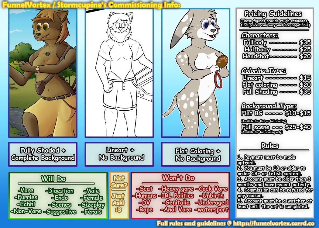 Pricing is per character, for comics or sequences each panel counts as a separate character.Examples and base price outlines for commissions. Shown price outlines are base estimates and may not reflect the final payment. End product is negotiable and a commission can be negotiated to something that is not shown as an example here. But I can't draw humans, sorry.